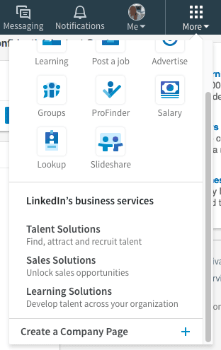 Interests has become ‘More’. Under this tab, you’ll be able to access other LinkedIn sites such as Slideshare. At the bottom of this tab is where you’ll find the option to create a company page.